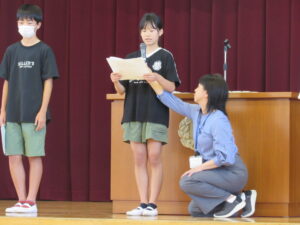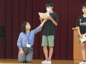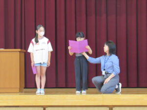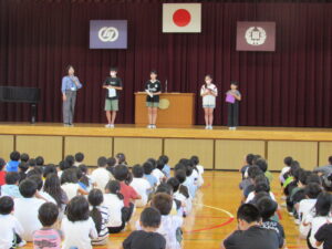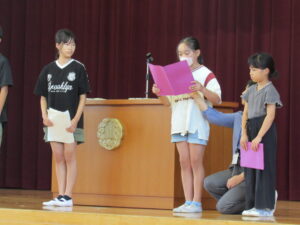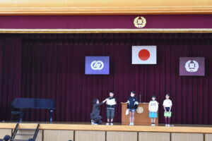 今年度から始まった二期制により、10月に前期終業式と後期始業式を行いました。17日(金)の前期終業式では、前期のまとめとして、代表児童が前期の学校生活のことや授業のこと、運動会のこと等について、頑張ってきたことや印象に残ったことを全校児童を前にして話しました。