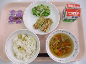 今日の献立は、栗ご飯、ちくわの磯辺揚げ、まめまめサラダ、秋のすまし汁、ぶどうグミ、牛乳です。