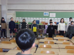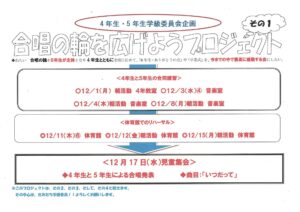 4年生と5年生の学級委員会が中心になって、「合唱の輪を広げようプロジェクト」をスタートしました。このプロジェクトのねらいは、合唱の輪を5年生が主体となり4年生とともに全校に広めて、「6年生・ありがとうの会」や「卒業式」を、今までの中で最高に感動する会にすることです。早速、4年生と5年生の合同練習(合唱交流)が始まりました。12月17日(水)は、児童集会で4年生と5年生が合唱を披露します。楽しみですね。♬