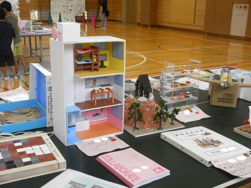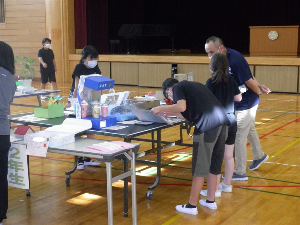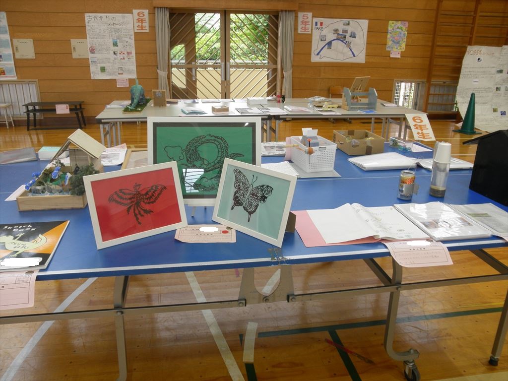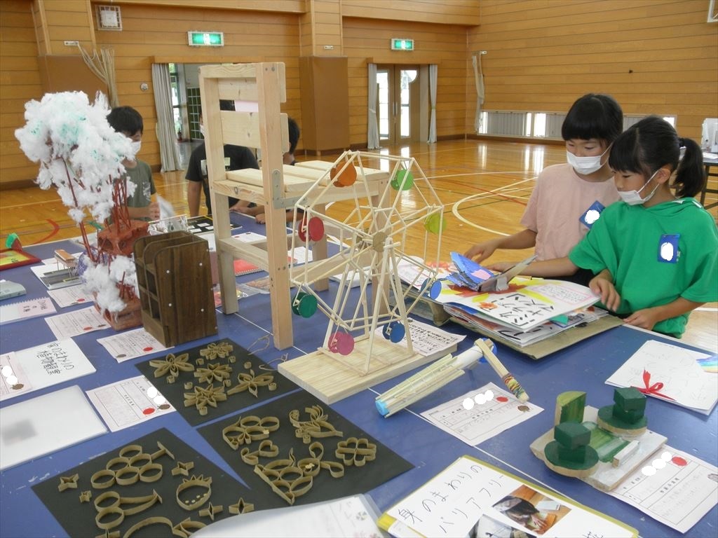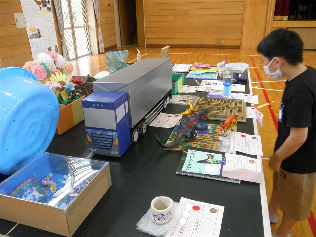 児童が夏休みに制作した作品や研究を体育館に展示し、クラスごとに見学会を行いました。