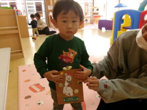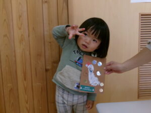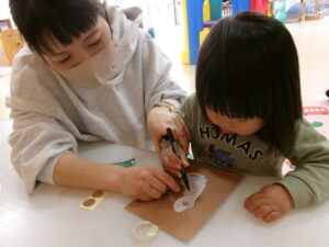 お家の方と一緒に、シールを貼ったり、キャラクターのまゆげや腕、ボタンを描きました。