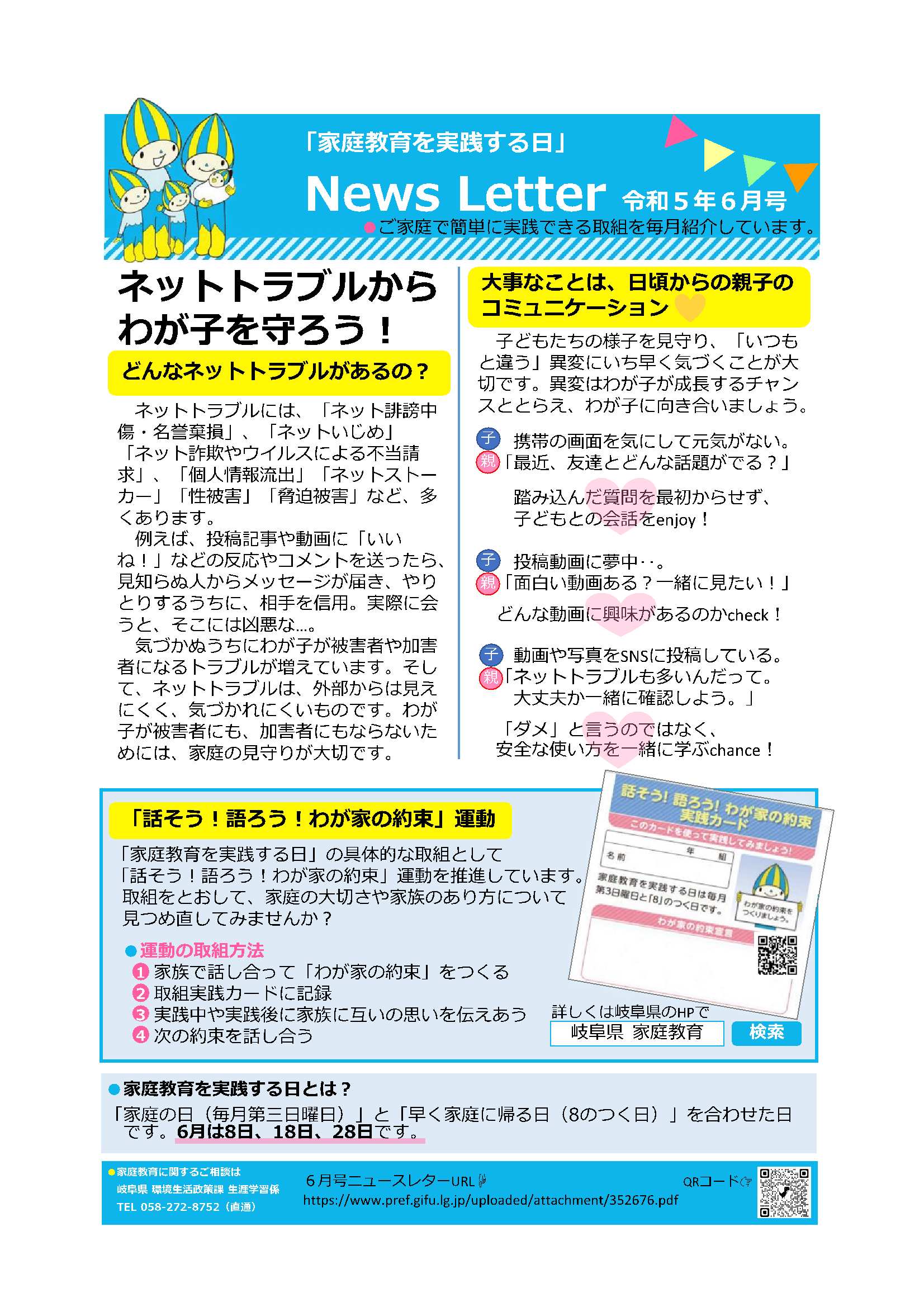 岐阜県では、「岐阜県家庭教育支援条例」の中で、「家庭の日(第三日曜日)」と「早く家庭に帰る日(8のつく日)」を、「家庭教育を実践する日」としています。「家庭教育を実践する日(家庭の日)」について意識する機会としていただきますようお願いします。