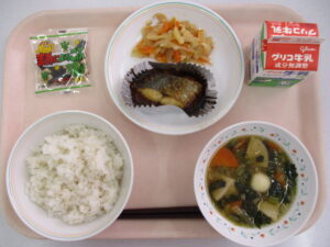 今日の献立は、麦ごはん、鰆のみそネーズ焼き、煮なます、白玉雑煮、まめによろこぶ、牛乳です。