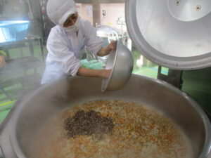 給食センターでは、乾燥したずいきを水で戻して灰汁抜きをし、細かく切ってみそ汁に入れます。