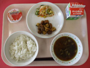 今日の献立は、川辺の麦ごはん、豚肉と高野豆腐のかりん揚げ、切り干し大根と糸こんにゃくのサラダ、ずいきのみそ汁、いちごゼリー、牛乳です。