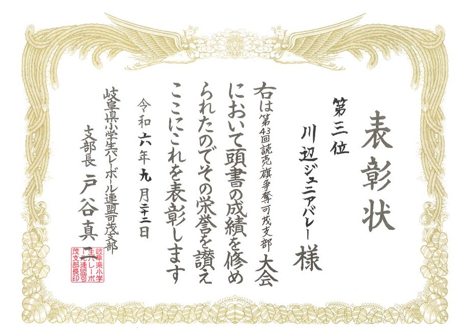 川辺ジュニアバレーのみなさんが、「第43回読売旗争奪加茂支部大会」で第3位の成績を収めました。おめでとうございます。