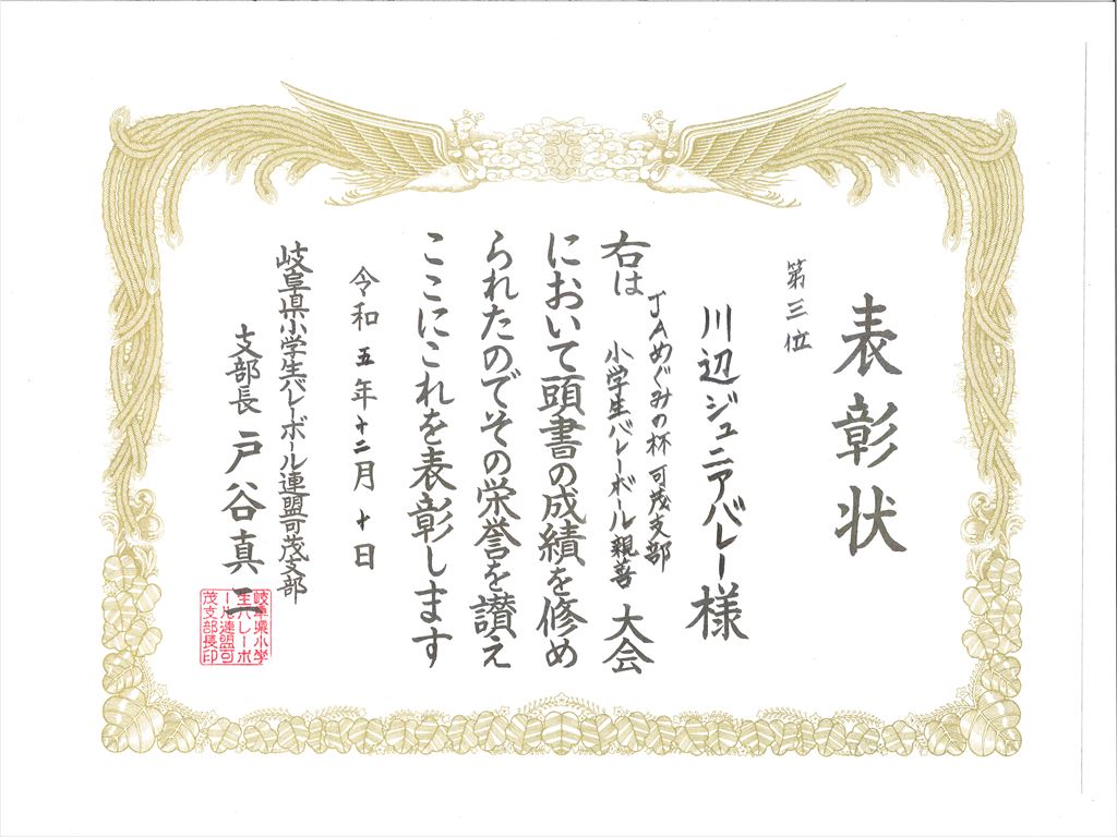 川辺ジュニアバレー女子が、「JAめぐみの杯可茂支部小学生バレーボール親善大会」で第3位の成績を収めました。