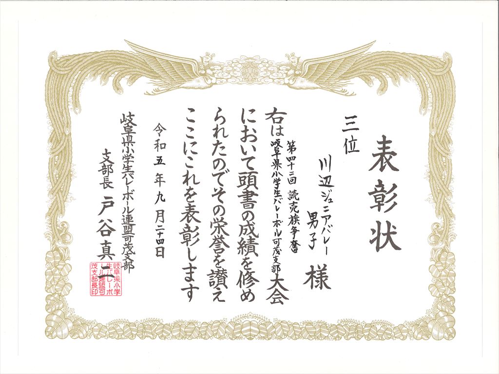 川辺ジュニアバレー男子が、「第42回読売旗争奪岐阜県小学生バレーボール可茂支部大会」で第3位の成績を収めました。