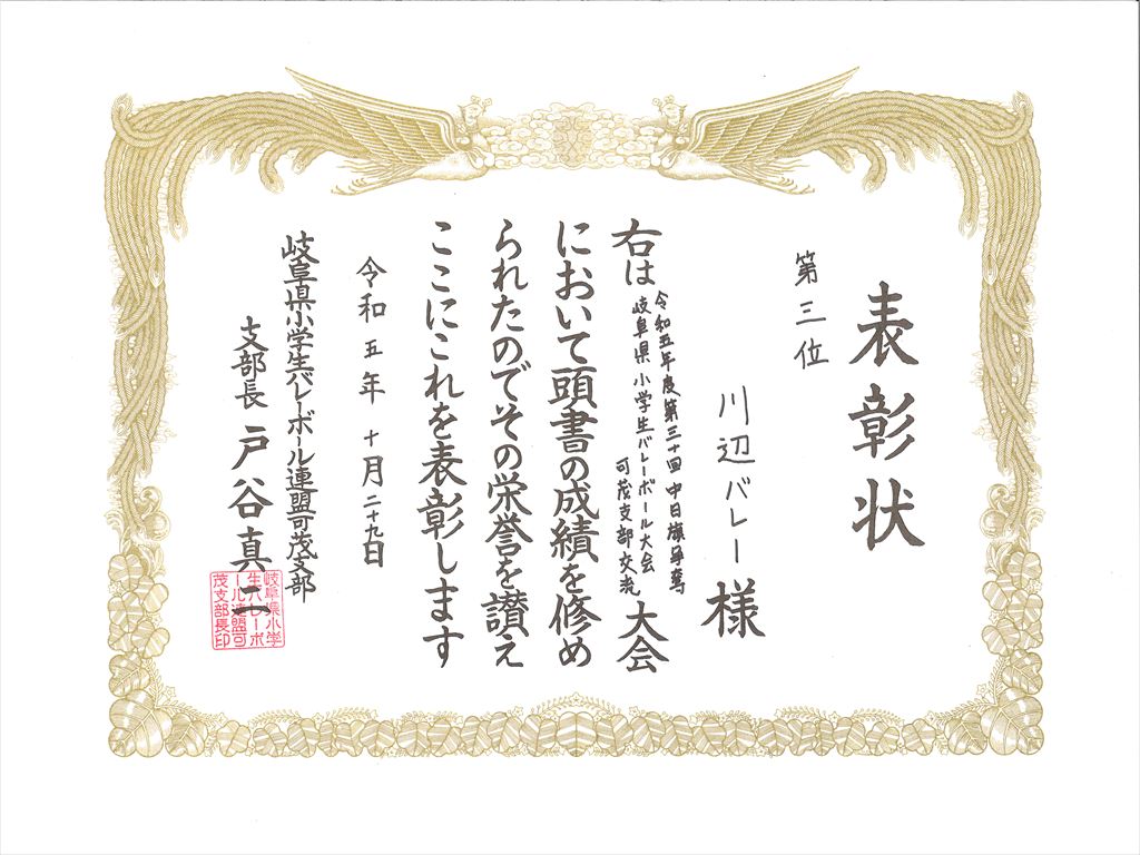 川辺ジュニアバレー4年生女子が、「令和5年度第30回中日旗争奪岐阜県小学生バレーボール大会可茂支部交流大会」で第3位の成績を収めました。