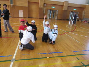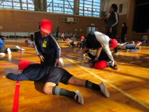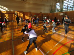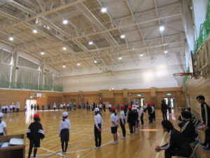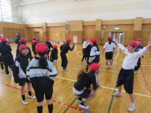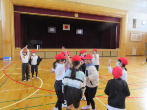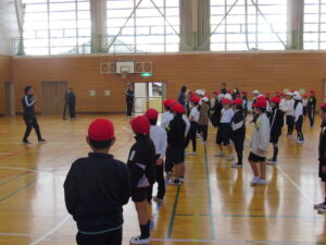 毎年恒例の川辺町小学校交流会を今年は川辺西小学校の体育館で行いました。岐阜県スポーツ協会の皆様を講師に招き、楽しみながら、運動機能の向上を図るACP(アクティブ・チャイルド・プログラム)を通して交流を図りました。学校交流タイムは楽しいレクリエーションを行い、歌声交流タイムは、全員が大きな輪になって「いつだって」を大合唱しました。会の最初は同じ学校の仲間と集まり気味でしたが、最後はお互いが仲良く話し合うような関係となる、素敵な交流会でした。