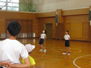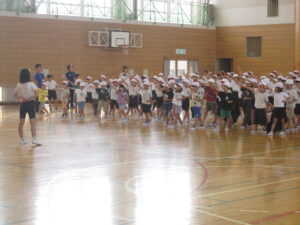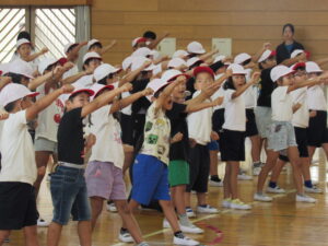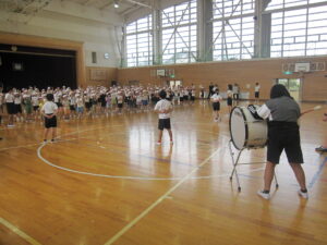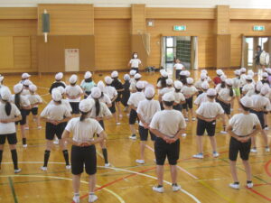 今日は白団が体育館で応援団練習を行いました。リーダーの元気な第一声でスタートしました。最初は白団全員での声出しや手拍子を中心に行いました。手の動かし方や体の上下移動にこだわって時間一杯練習に取り組みました。