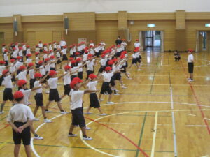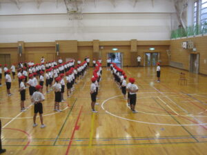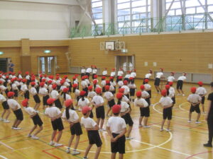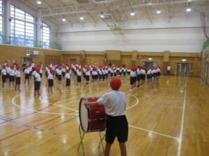 今日から赤白両団が運動場と体育館に分かれて団練習を行う予定でしたが、雨天でしたので赤団は体育館、白団はこれまで通り、各教室に分かれて練習を行いました。赤団は団全員での声出し、手拍子、団演技の練習を中心に行いました。初めての団練習ということで、応援リーダーも緊張した様子で団員に教えていました。なお、白団の団練習は、次回紹介したいと思います。