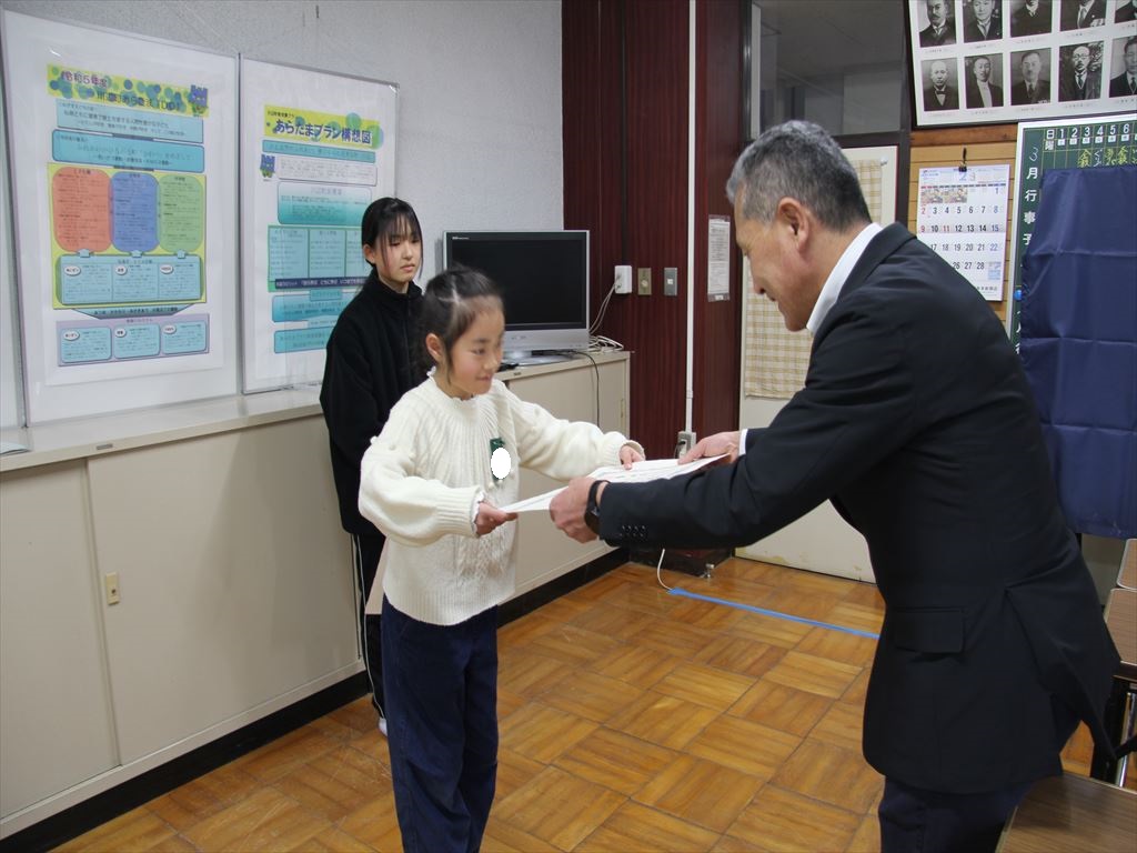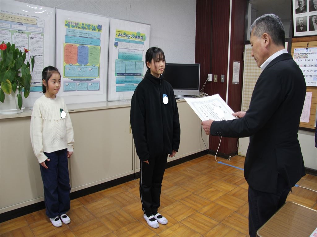 校長室で賞状を渡し、2名が描き上げた作品と一緒に記念撮影をしました。