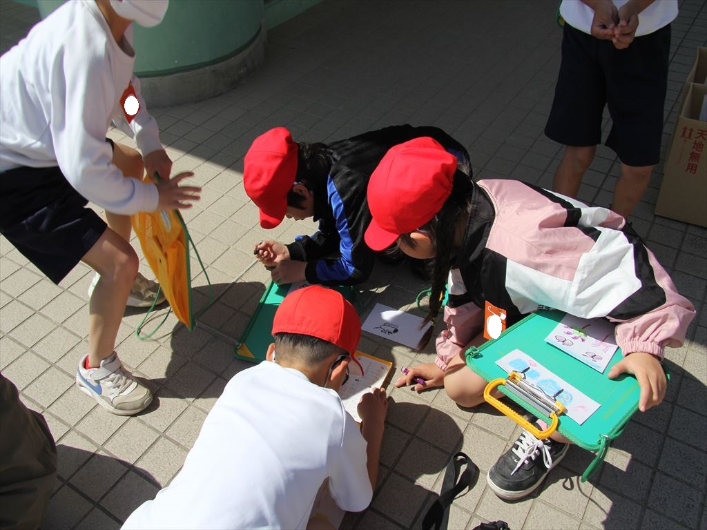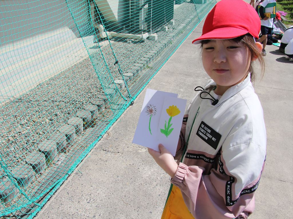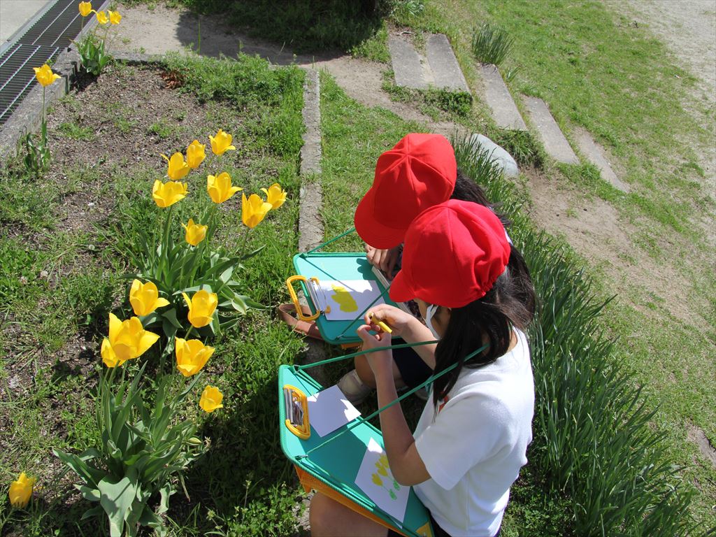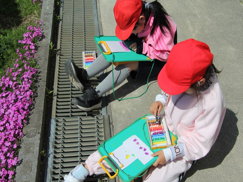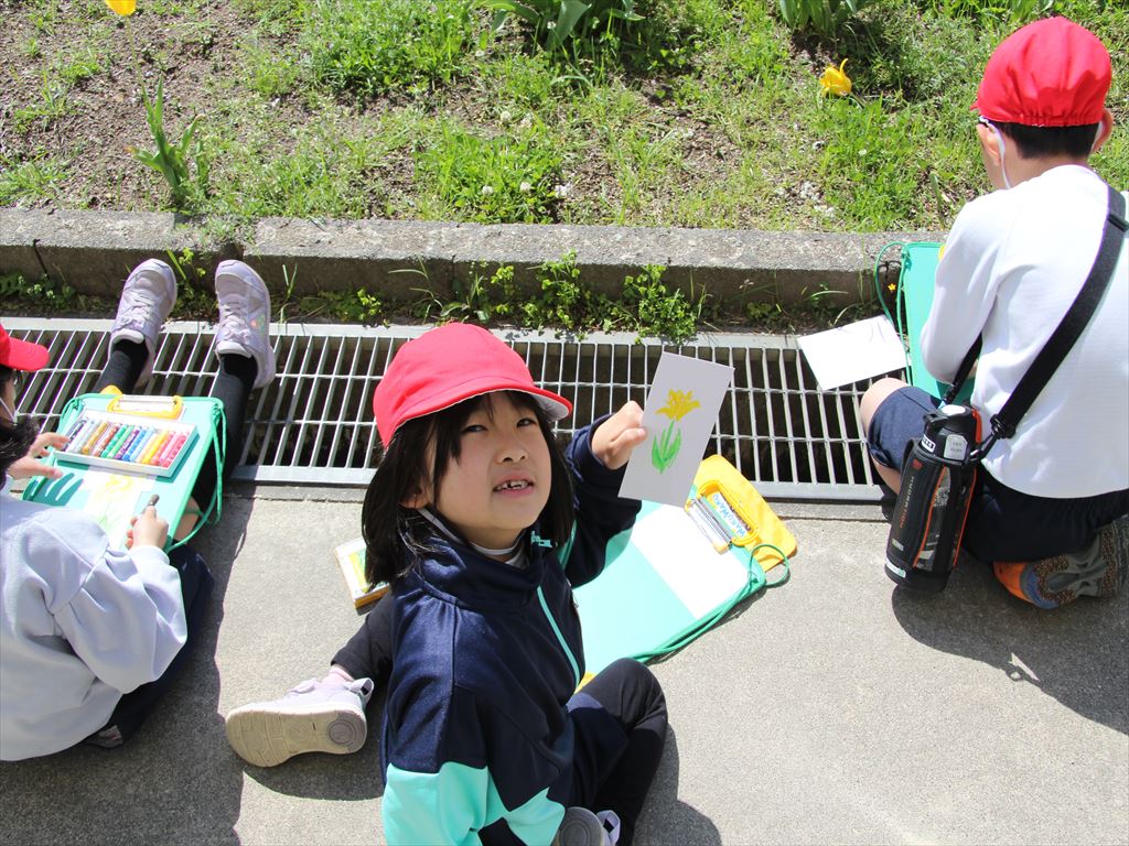 2年生が図工の授業で春のスケッチを行いました。運動場の花壇などを見て、春の花や生き物を観察し、画用紙に書きました。
