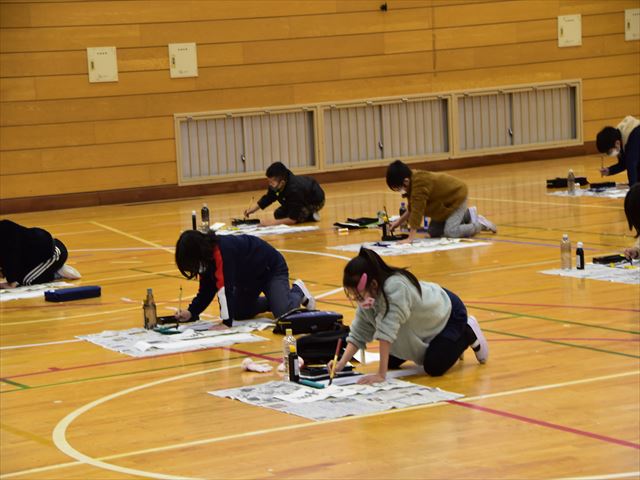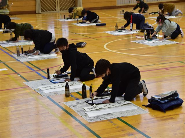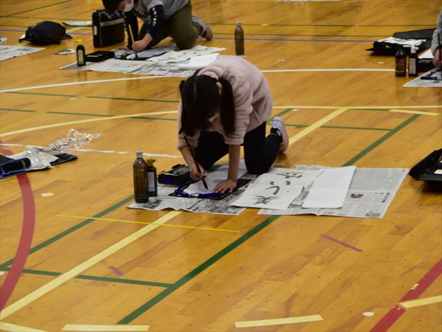 4年生が5、6時限目を使って書き初め会をしました。挑戦する文字は「美しい空」です。バックミュージックは春の海。正月を感じながら取り組む4年生でした。