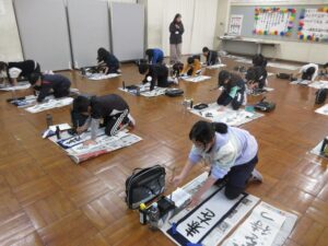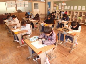 昨日と今日の2日間、学年ごとに書き初め会を行いました。1・2年生は硬筆、3年生以上は毛筆での書き初めでしたが、新年の気持ちも新たに、どの子も真剣に取り組んでいました。