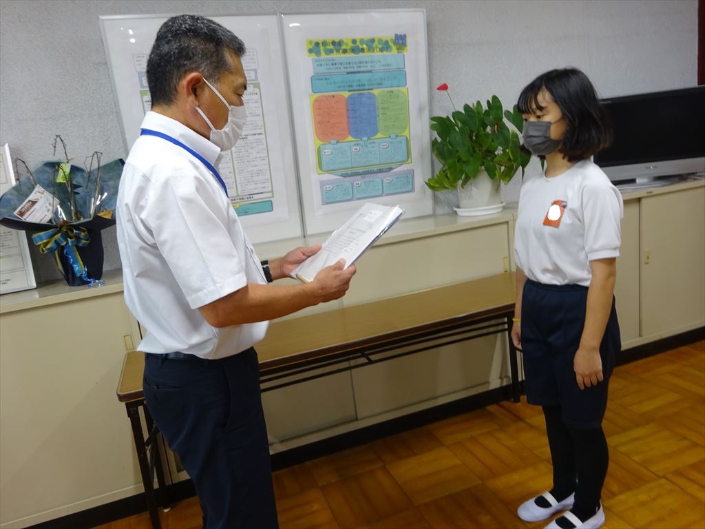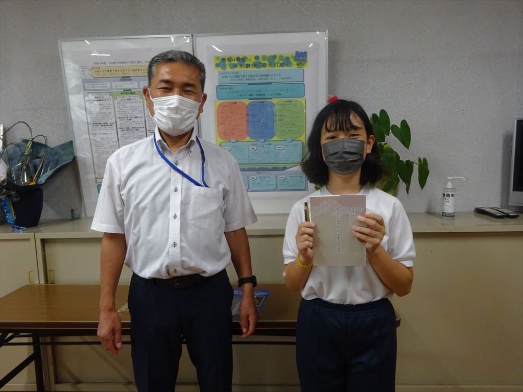 校長室で作品集と副賞を渡し、頑張りを称えました。