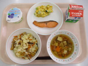 今日の献立は、人参ごはん、銀鮭の塩焼き、かぼちゃと豆のサラダ、すまし汁、ブルーベリーゼリーです。