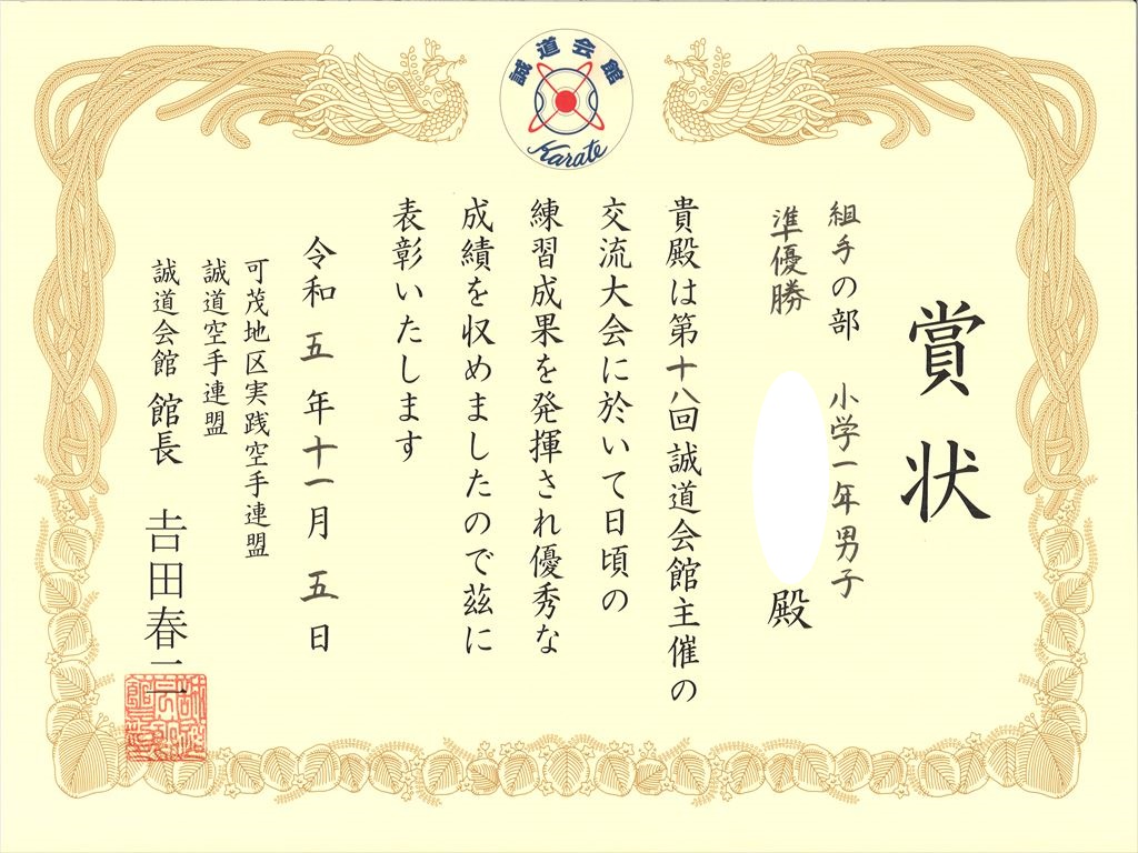 令和5年11月5日に行われた「第十八回誠道会館主催の空手の交流大会」組み手 小学1年男子の部で、本校の1年生児童が準優勝を収めました。