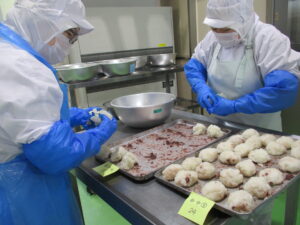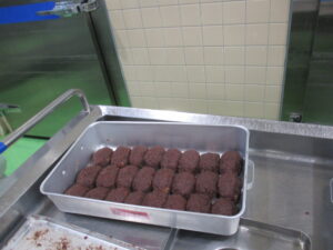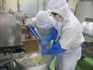 中のごはんが見えないようにあんこをつけるのはとても難しいですが、さすが調理員さんです!とても手早く、ササっと作ってみえました。