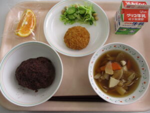 今日の給食は、里芋おはぎ、れんこんのはさみ揚げ、まめまめサラダ、けんちん汁、オレンジ、牛乳です。