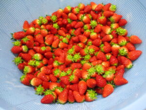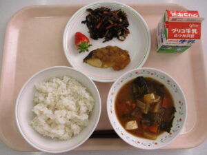 今日の献立は、麦ごはん 鯖のおろしかけ、ひじきの煮つけ、ずいきのみそ汁、川辺のいちご、牛乳です。