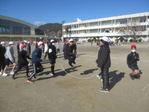 2月19日(木)20分休みに、縄跳び「8の字跳び記録会」があります。この日に向けて1月20日から毎週火・木曜日の20分休みに練習に励んできました。また、クラスで目指す目標回数だけでなく、岐阜県教育委員会が行っている「チャレンジスポーツinぎふ」の催しにも参加しています。これは、岐阜県内の小中学生が参加している催しです。たくさんのライバルを相手に、最後まで精一杯に取り組みます。