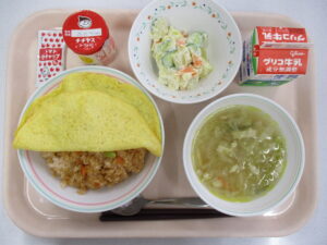 今日の献立は、オムライス、ポテトサラダ、パスタのスープ、ヨーグルト、牛乳です。