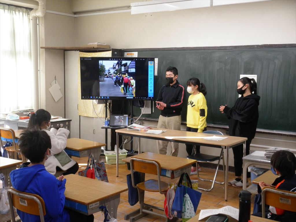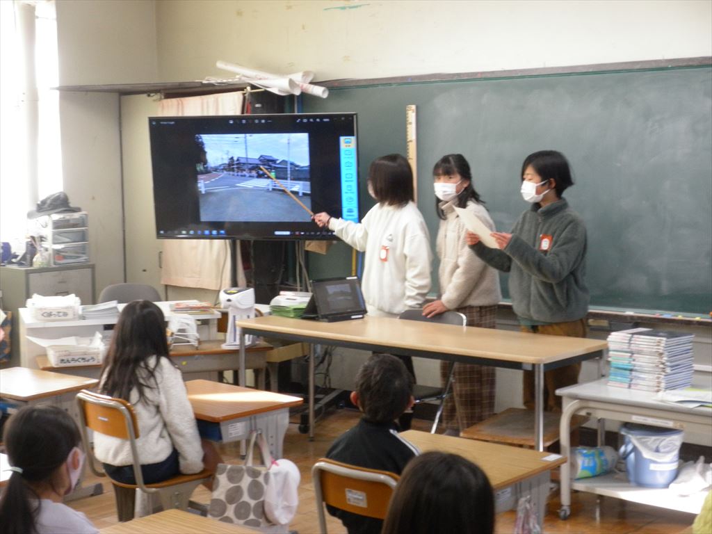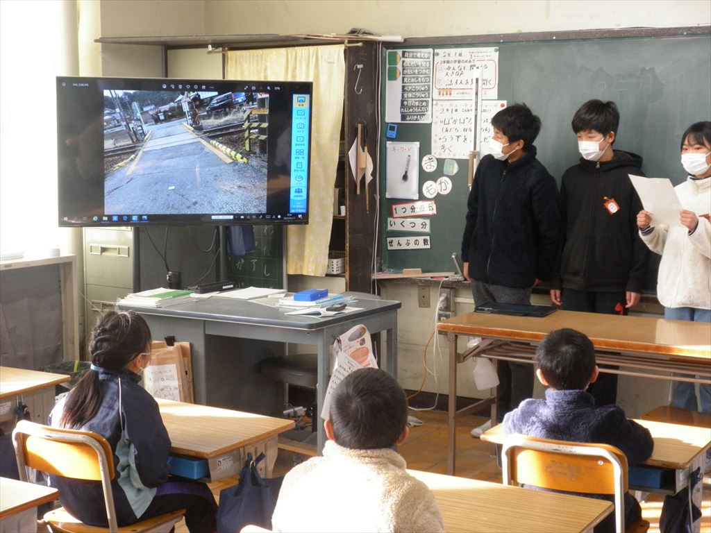 通学班ごとに分かれて、画像をモニターに映し、6年生が危険箇所の説明をしました。