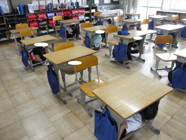 机の下では、頭を守り机が倒れないように「サルのポーズ」を実践しました。