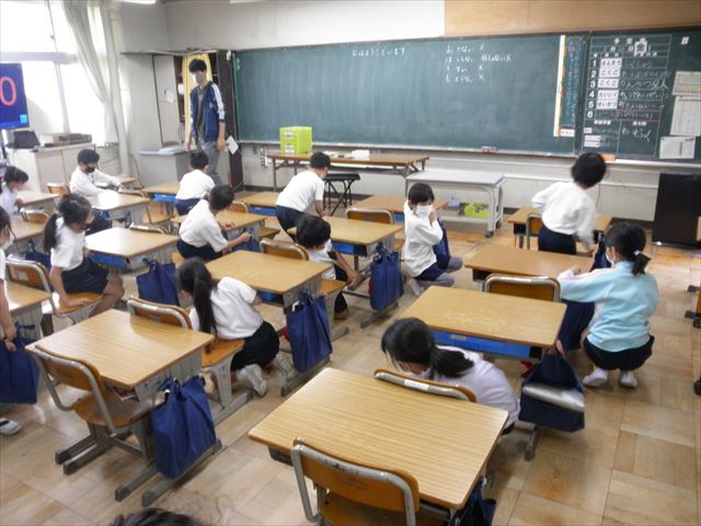 本日5月20日(金)は、その第1回目です。朝の活動の時間に、すべての学級の子どもたちが、担任の先生と命を守ることについて考え、シェイクアウト訓練と運動場への避難を行いました。