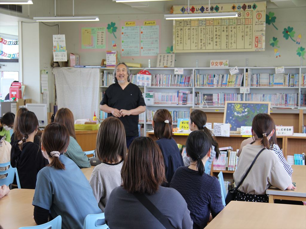 はじめに学校歯科医の加藤賢也先生から保護者向けに講話をいただきました。毎日のブラッシングや保護者による仕上げ磨きの重要性などをお話しいただきました。