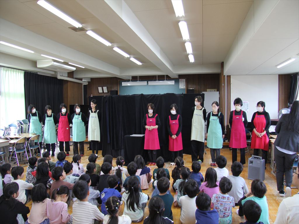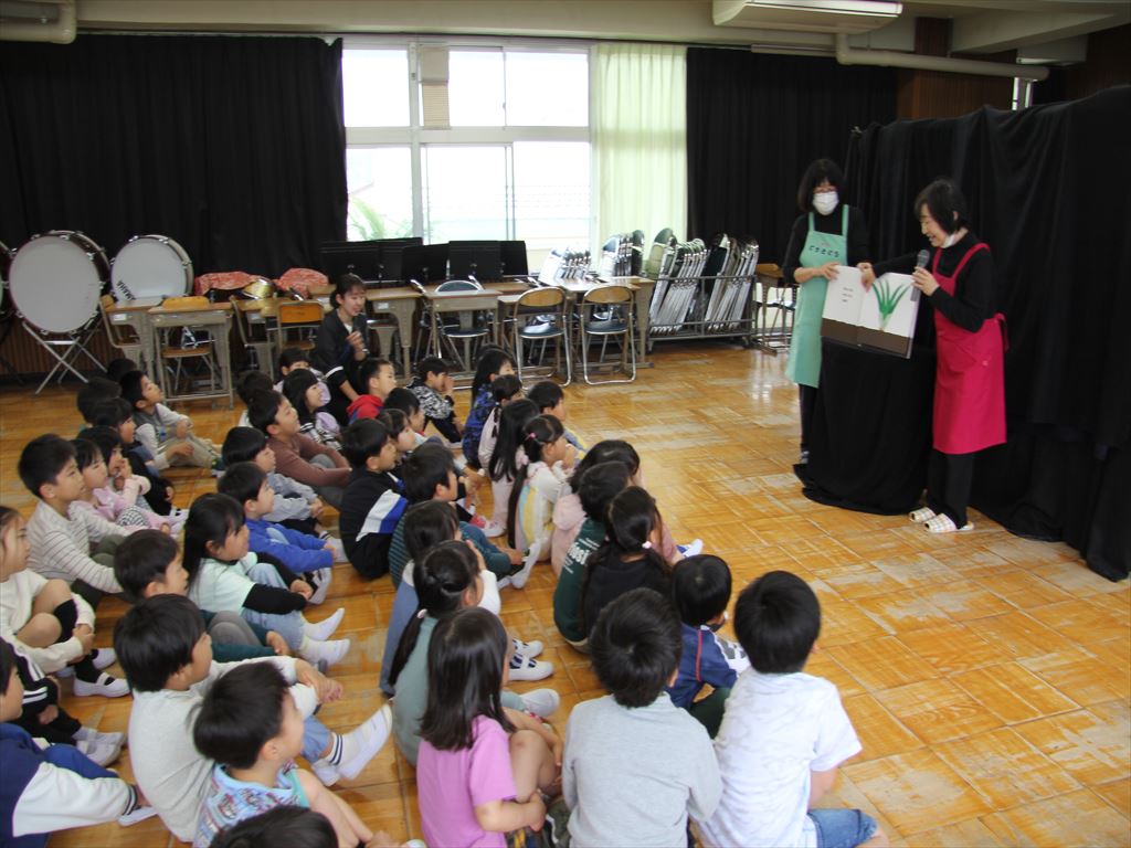 4月16日(火) 朝の活動の時間に、「ぐりとぐら」さんが1年生に読み聞かせをしてくださいました。