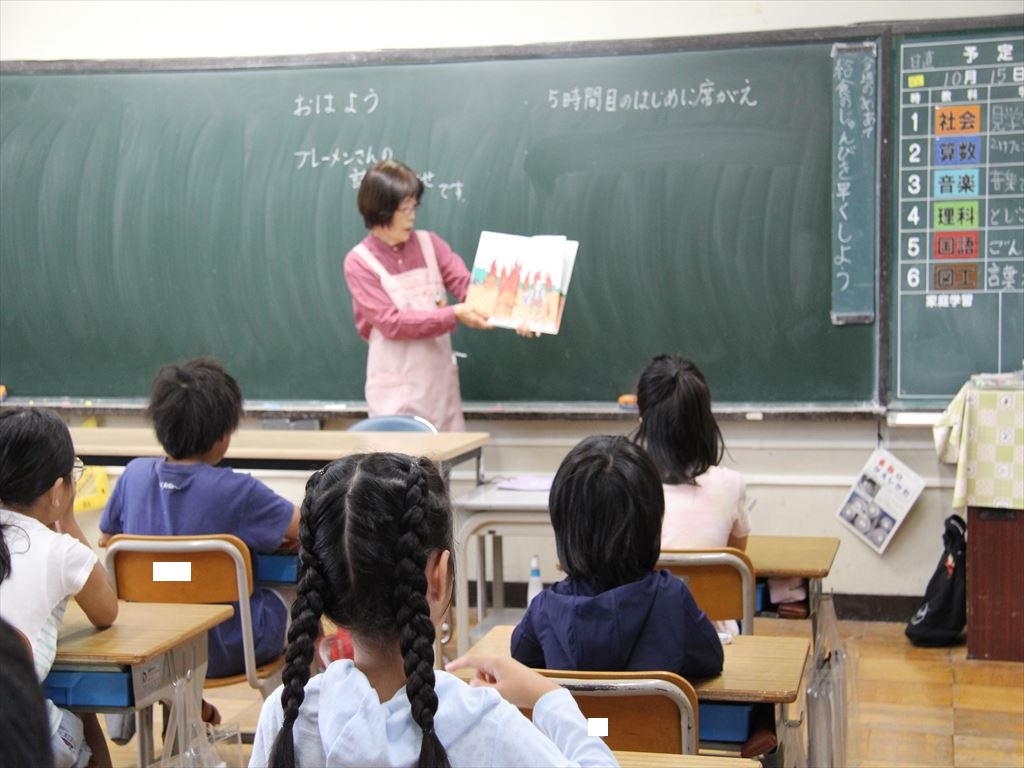 朝読書の時間に、ブレーメンさん、ぐりとぐらさんに来ていただき読み聞かせを行いました。
