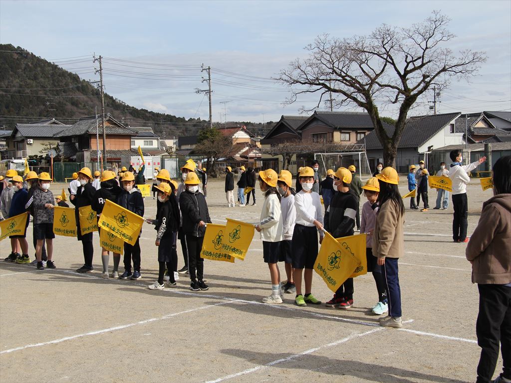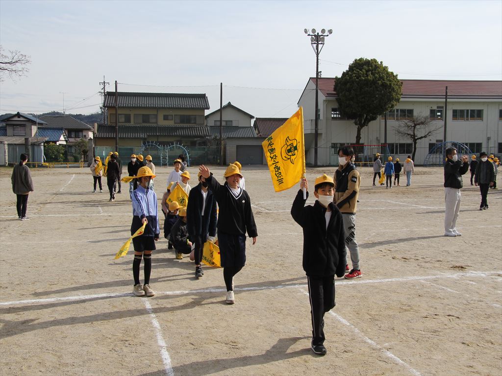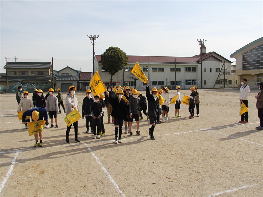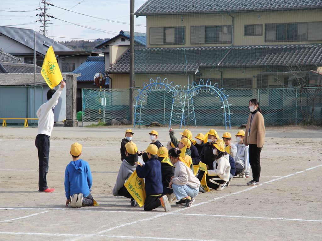 通学班の新班長と新副班長が、旗の使い方の練習をしました。