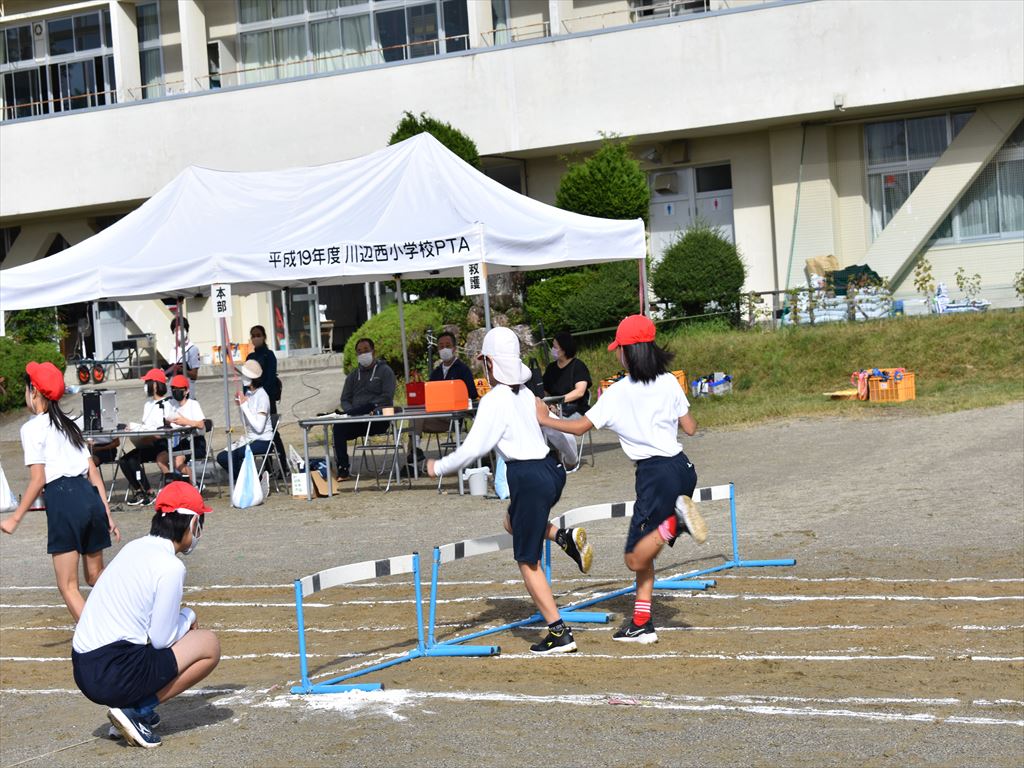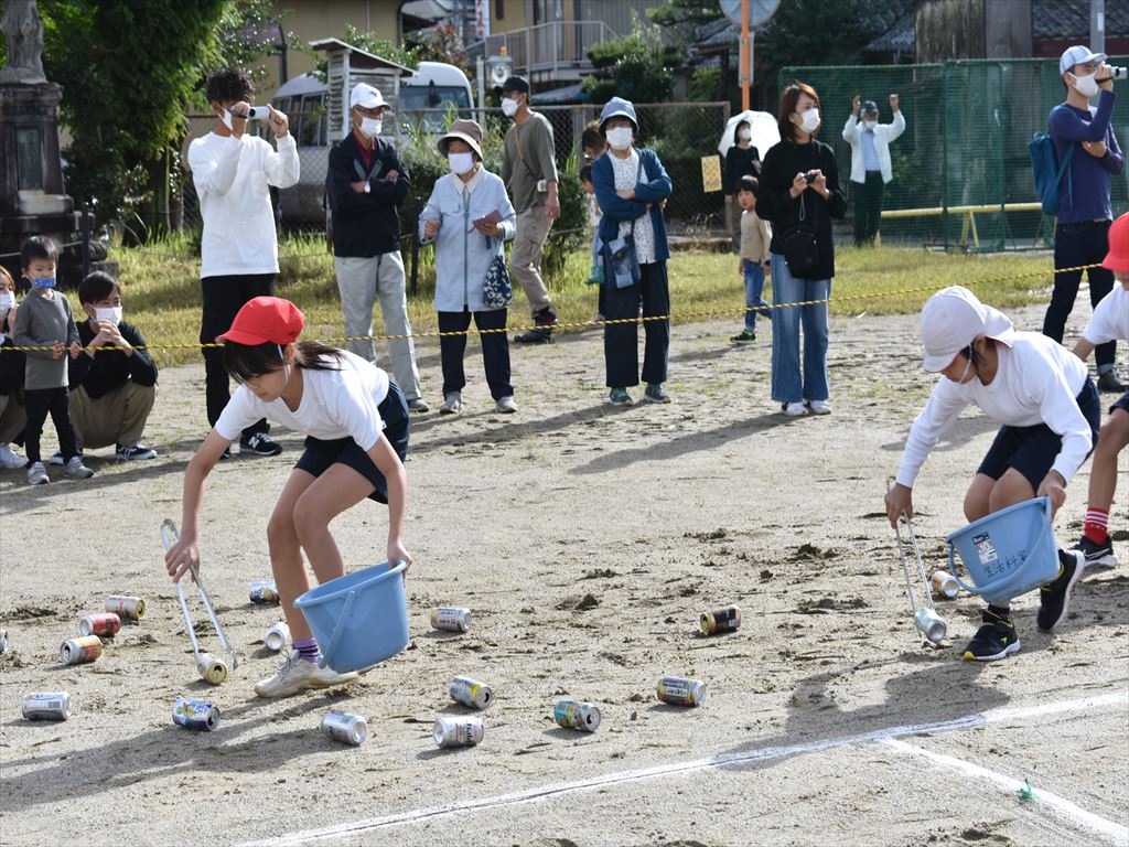 ・中学年の個人競技は「とんで、拾って、走れ」です。スタートから「フラフープ」「アルミ缶拾い」「ハードル」という3つの障害物を乗り越えて、ゴールを目指して走りました。