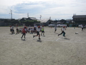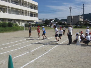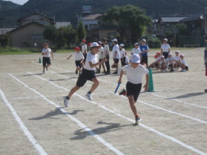 運動場で団体リレーの練習を行いました。練習メニューは、テイクオーバーゾーンでバトンパスをすることやこの区間を上手に使うこと、実際にリレーを行うことで、当日の係の連携の確認でした。上手くできたことと課題が見つかりました。