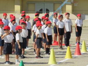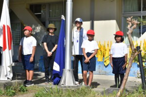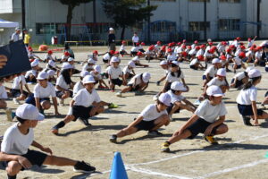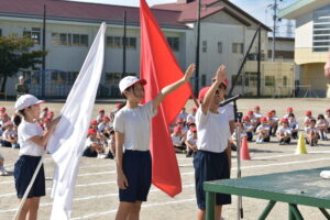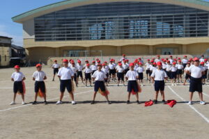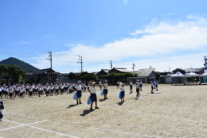 全校児童が参加して、運動会前の最後の総練習を行いました。開会式と閉会式、入場と退場、準備体操と国旗・町旗・校旗の掲揚等、各係の担当者が本番同様に動きやセリフの確認を行いました。また、元気よく声を出しての返事や移動時にキビキビと動いたり、礼のタイミングも確認したりしました。全校児童と担当の子どもたちは緊張しながらも本番をイメージしながら元気よく活動していました。