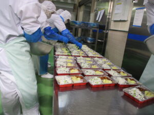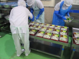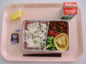 給食センターでは、枝豆とわかめのごはん、豚肉のかりん揚げ、さつまいもの天ぷら、ゆでブロッコリー、ミニトマトを、おいしそうに見えるように、きれいにパックに盛り付けました。