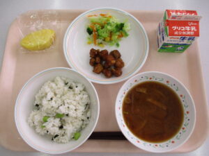 今日の給食は、枝豆とわかめのごはん、豚肉のかりん揚げ、ブロッコリーとキャベツのサラダ、合わせみそ汁、生パイン、牛乳です。