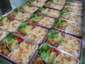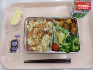 給食センターでは、人参ごはん、ホキのレモン風味、さつまいもの天ぷら、ゆでブロッコリー、ミニトマトを準備しました。