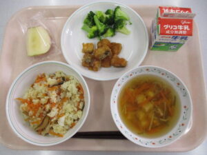 今日の献立は、人参ごはん、ホキのレモン風味、ゆでブロッコリー、すまし汁、りんご、牛乳です。