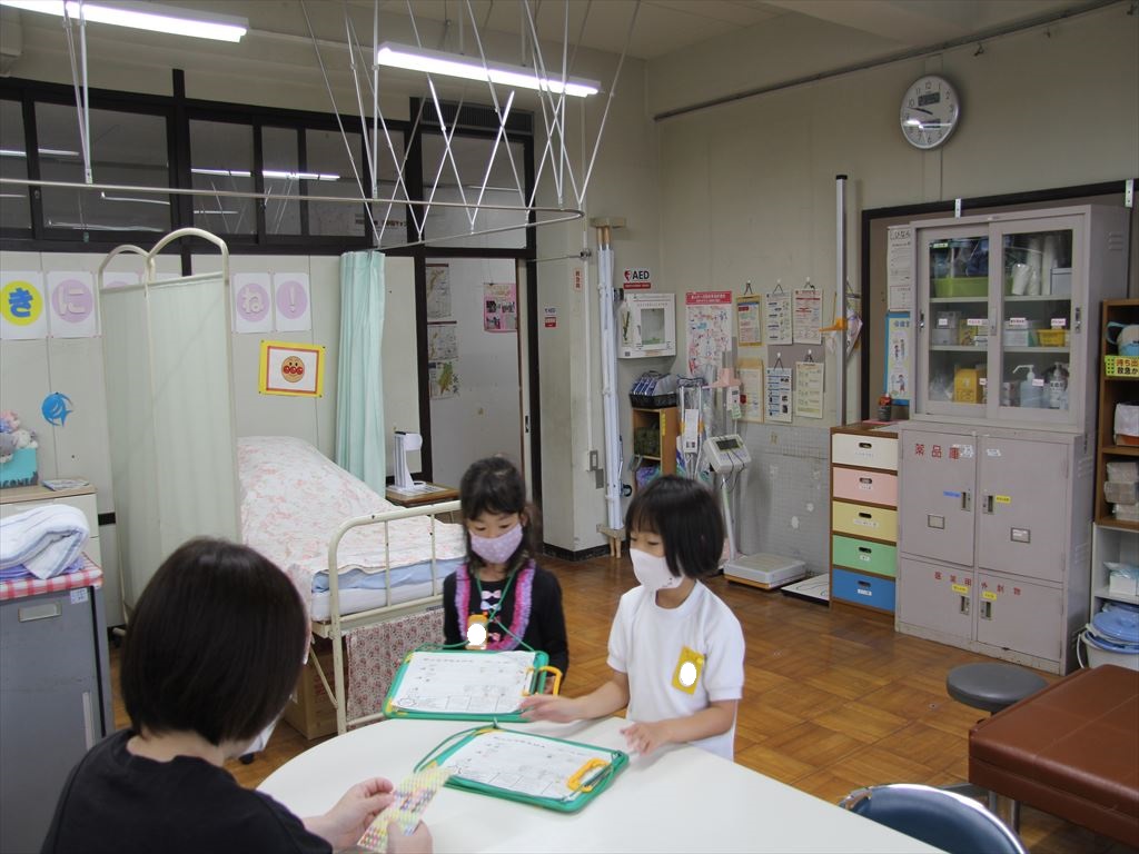 体育館を出発し、理科室や家庭科室の場所などを確認しました。職員室や校長室、保健室では、部屋への入り方を2年生に教えてもらいました。