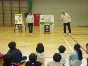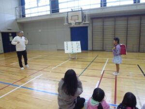 今日の3時間目、1・2年生は岐阜警察生活安全課の方々にお越しいただき、連れ去り防止教室を行いました。子ども達は、劇仕立てで進んでいくお話を真剣に話を聞いたり、大声を出す練習をしたりと、自分の身を守ることについて学ぶことができました。