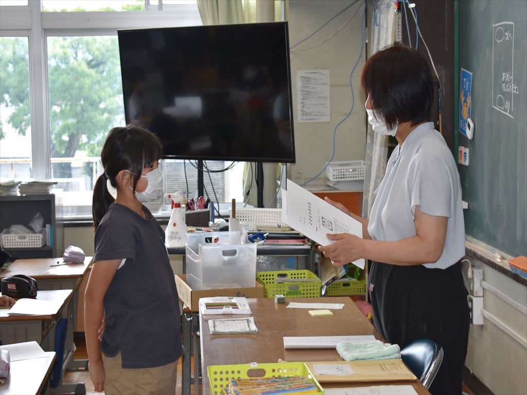終業式の後は、担任の先生から「こどものすがた」を一人一人に手渡され、1学期の自分のがんばりを確認することができました。