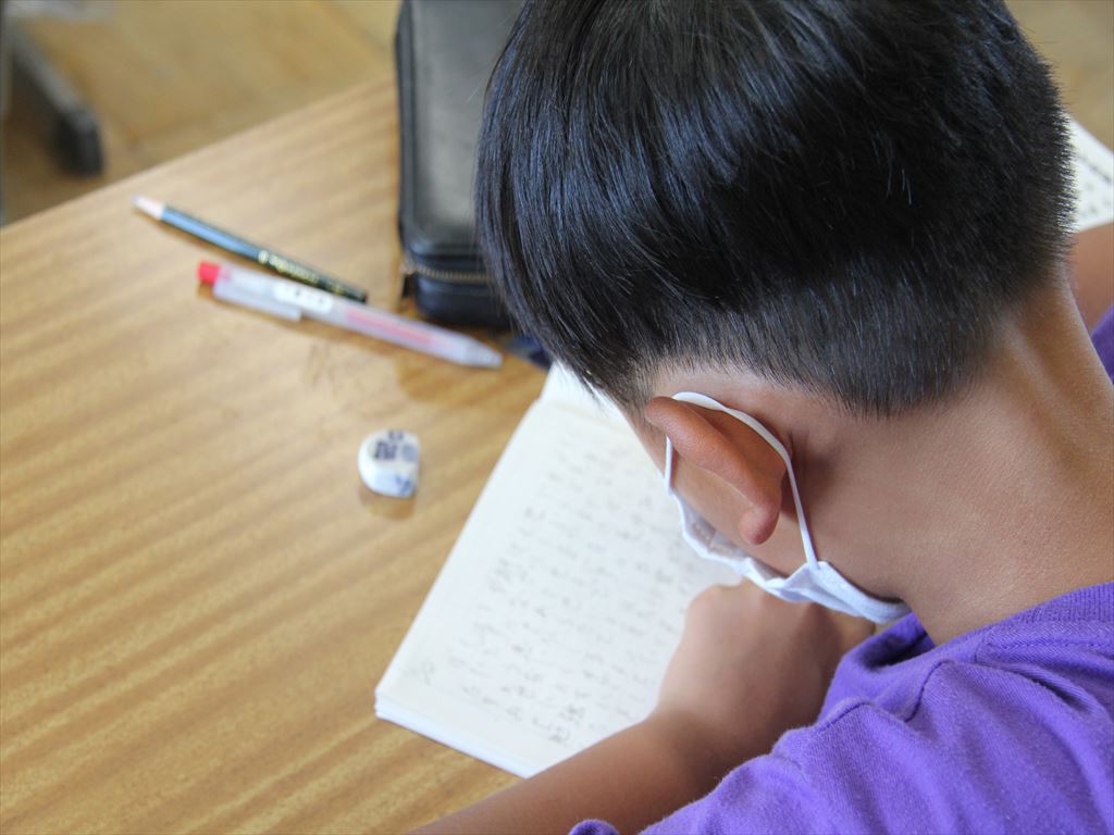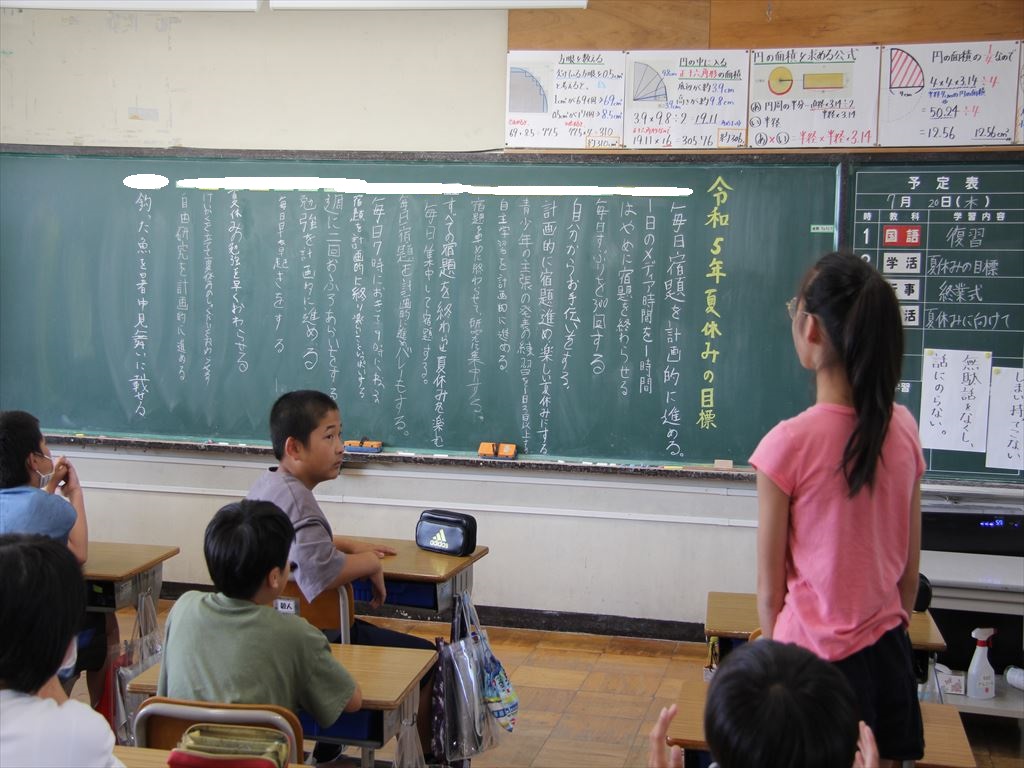 終業式が終わった後は、1学期の最終学活です。学級ごとに夏休み中の個人目標をノートに書いたり発表したりしました。