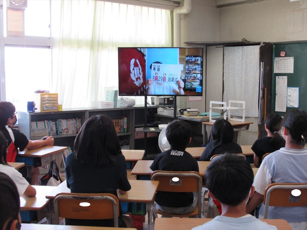 1学期の終業式は、体育館に集まらずに各教室をリモートでつないで行いました。