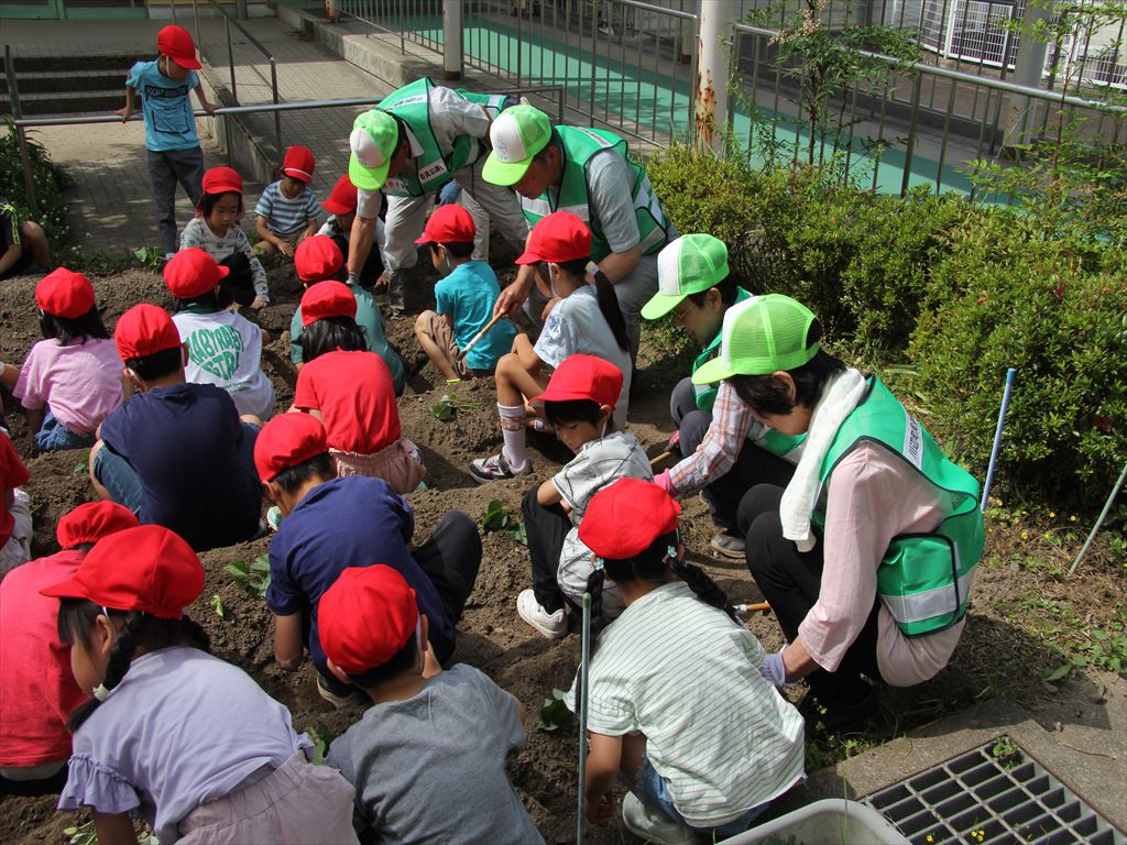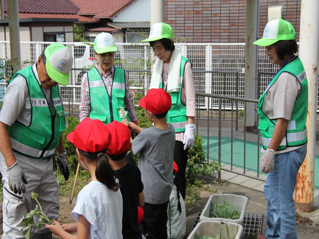 民生児童委員さんが苗を植えるときに、優しく見守ったり、手伝ったりしてくださったおかげで、全員が上手に苗植えを行うことができました。