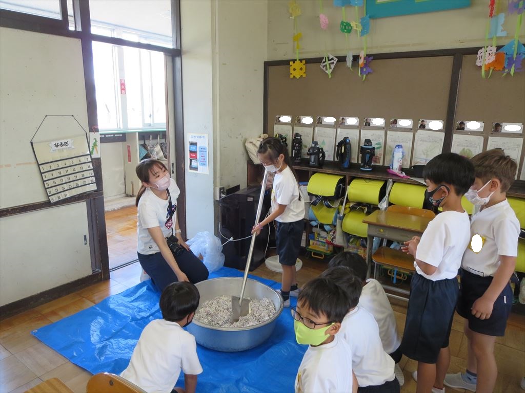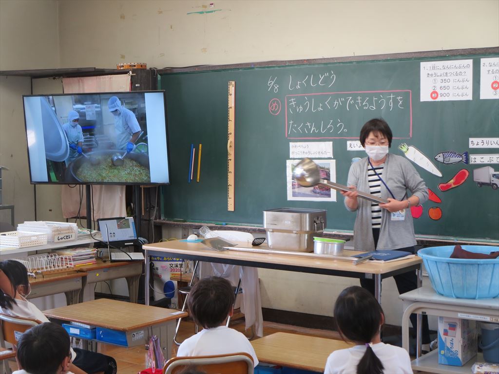 授業の中では、給食センターの様子を映像で見たり、実際に使われている器具に触れたりすることができました。