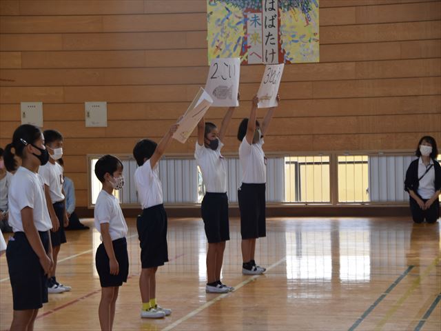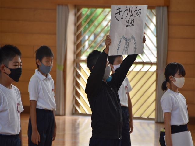 体育館に全員、集まることができなかったため今週の朝の活動時間を使って1年生を迎える会を実施します。今日は、4年生が発表しました。学校クイズを行って1年生を迎えました。工夫した発表でした。きっときっと練習を積み重ねたのでしょうね。